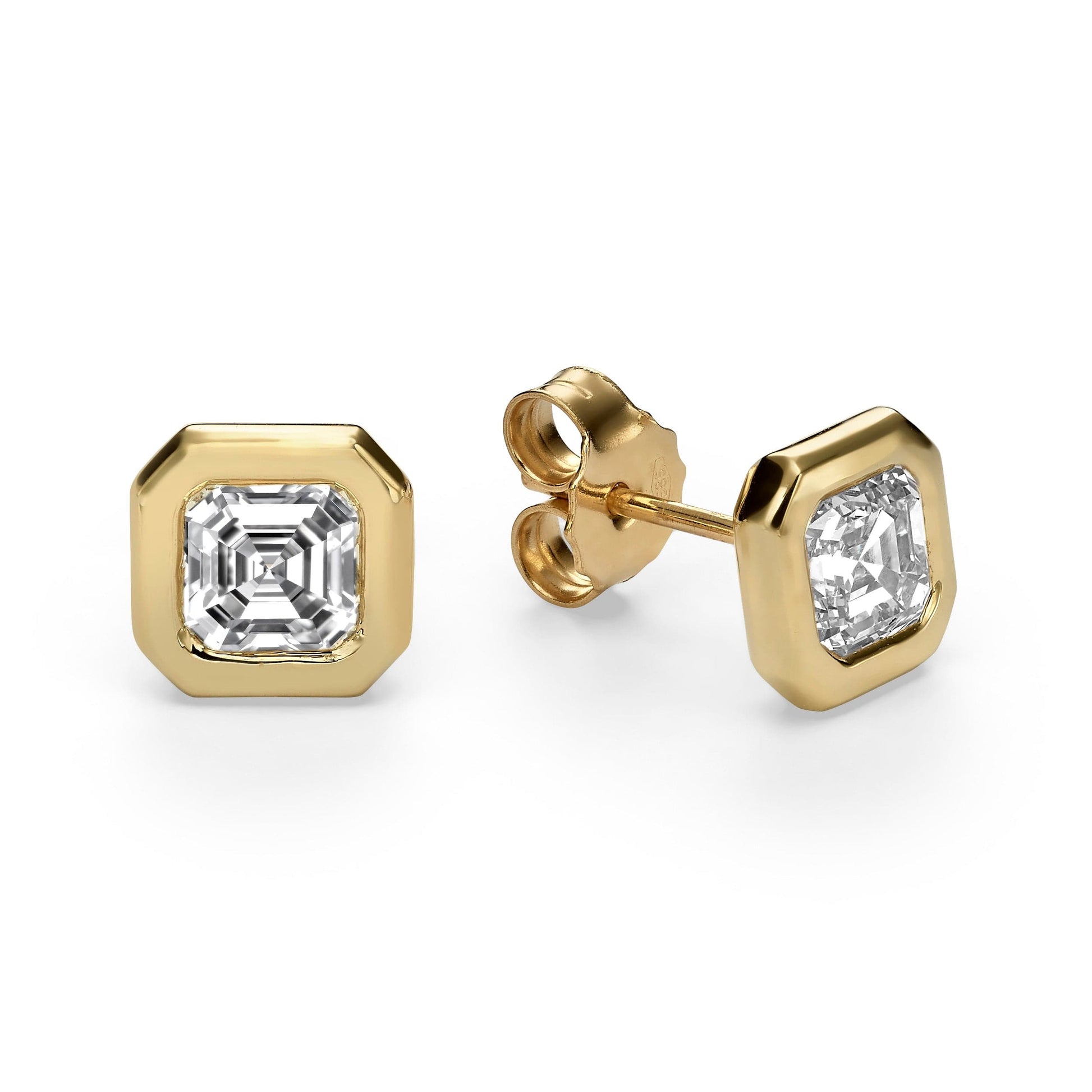 2 ct Asscher Cut Natural Diamond Bezel Set Stud Earrings Yellow Gold