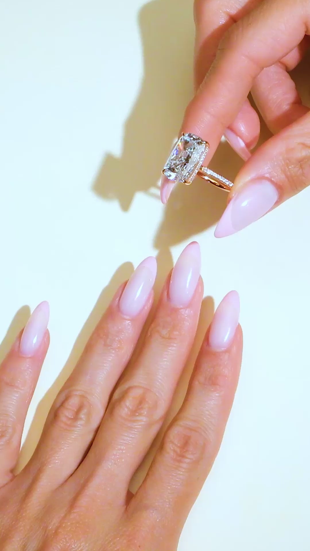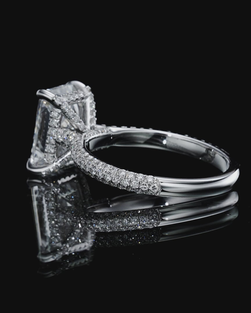 3.82 Carats Lab Grown Radiant Cut Micropaved Three Rows Hidden Halo Diamond Engagement Ring