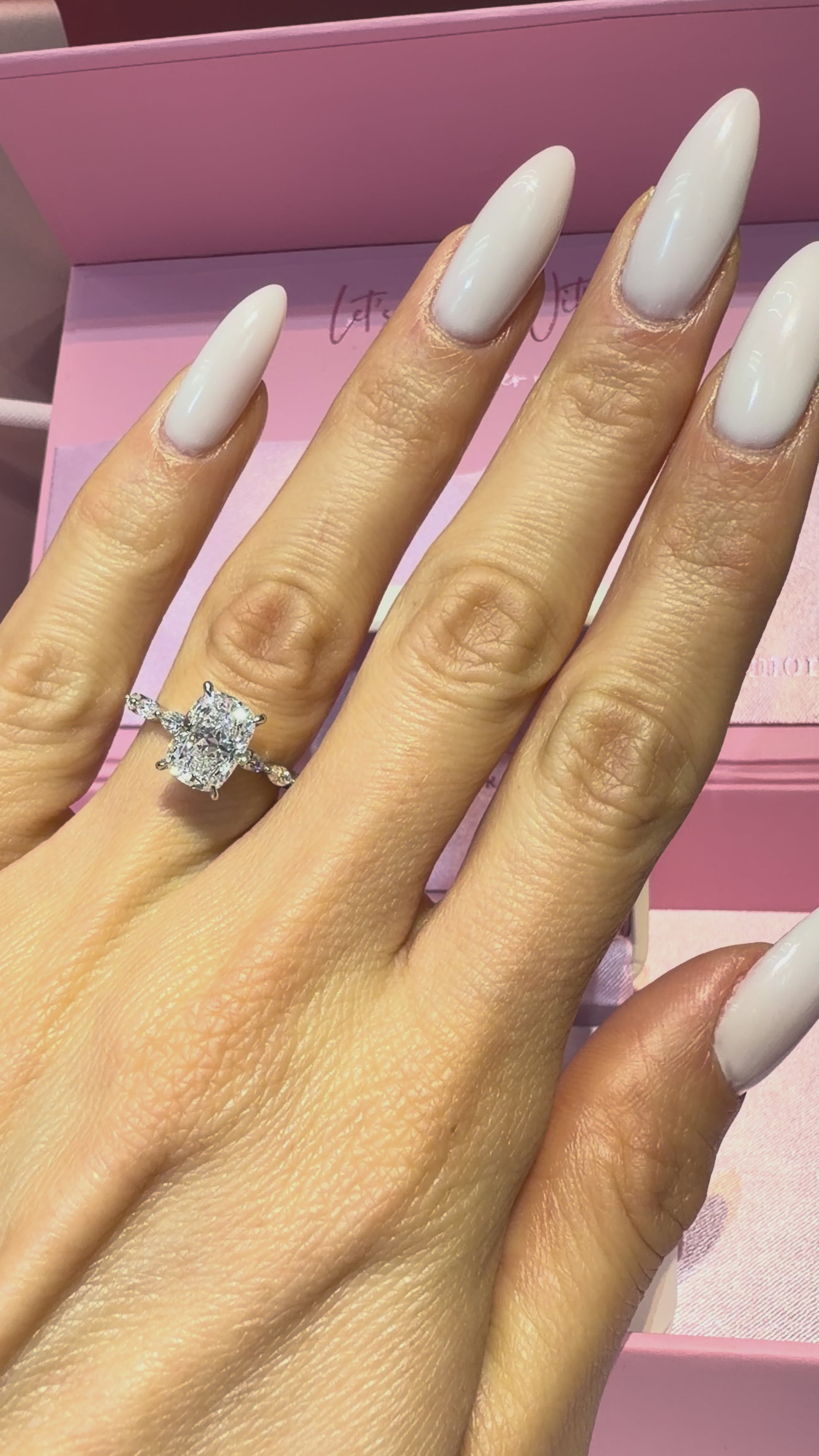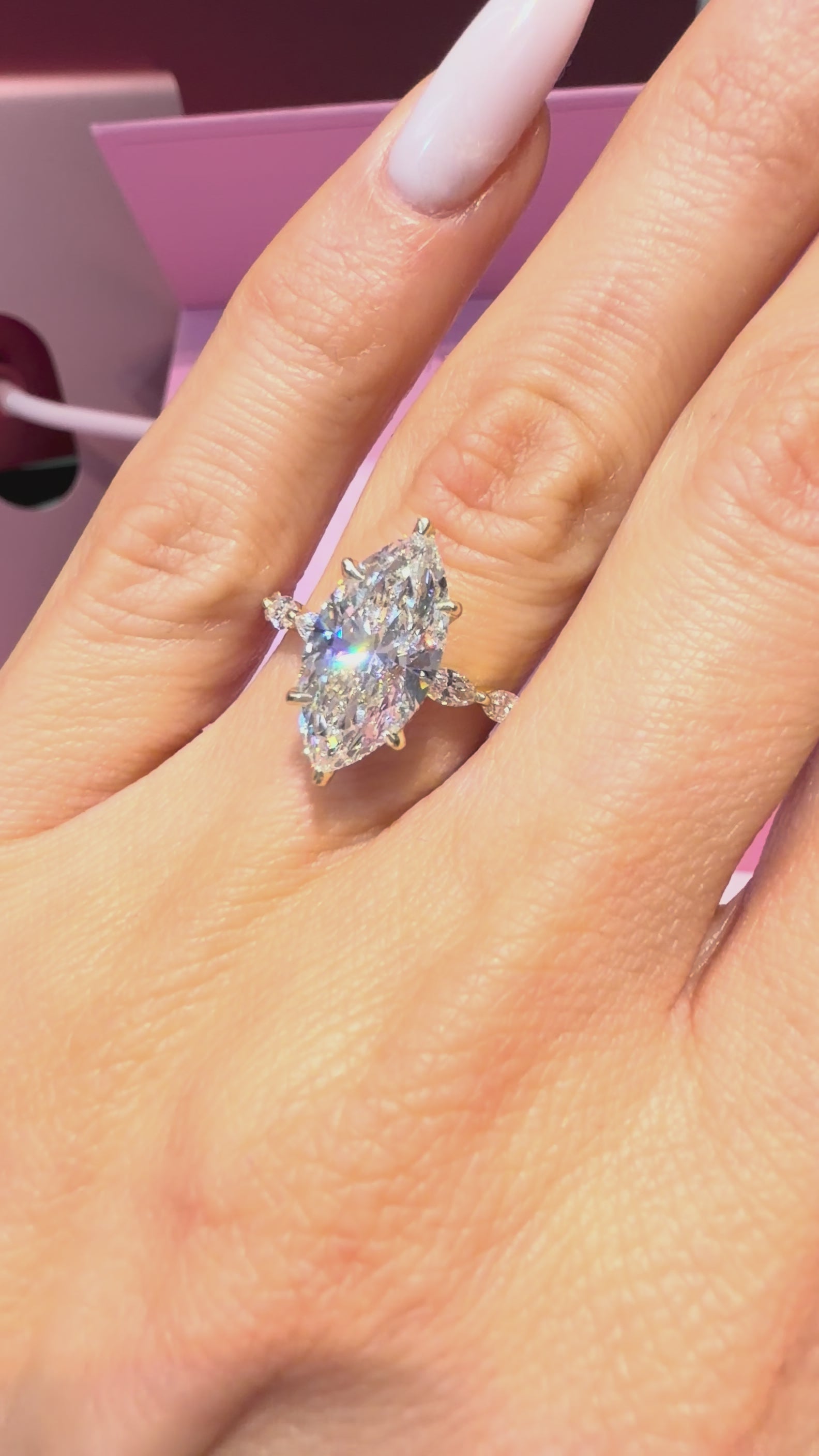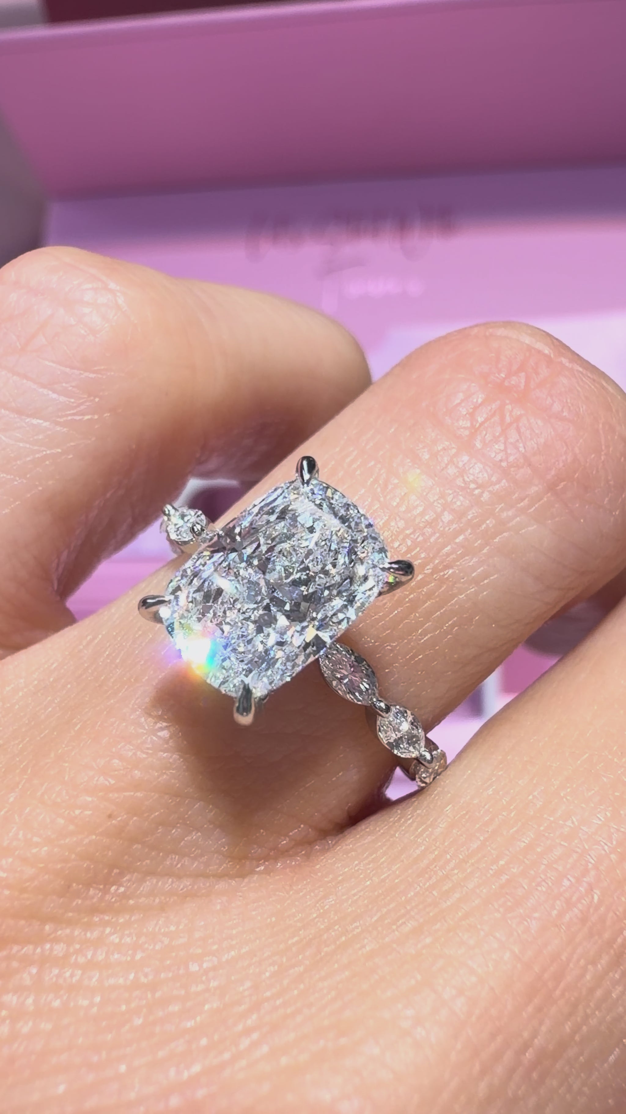 3.01 Carats Lab Grown Elongated Cushion Cut with Marquise Side Stones Hidden Halo Diamond Engagement Ring