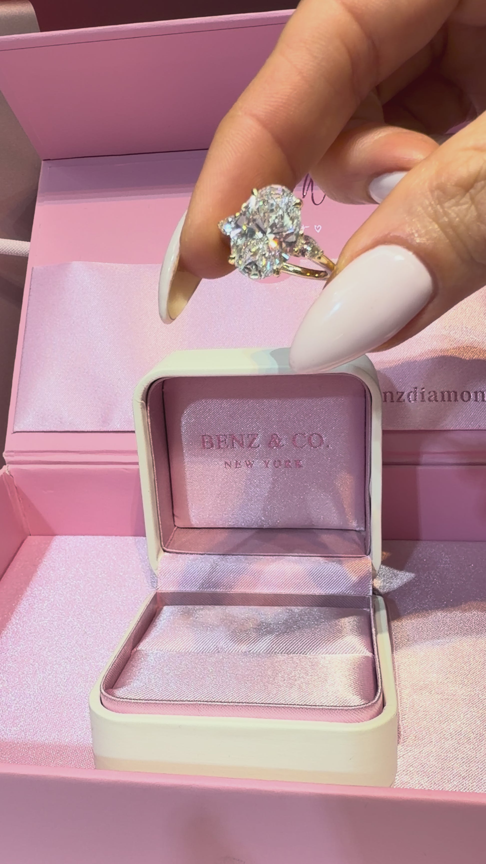 5.36 Carats Lab Grown Oval Cut with Pear Shape Side Stones Diamond Engagement Ring in Yellow Gold