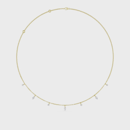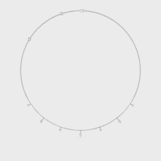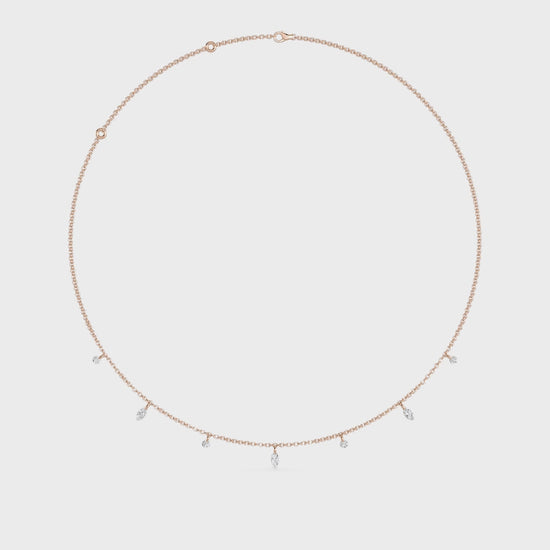 A modern and artistic twist on the classic diamond necklace, featuring seven pierced floating diamonds in a refined mix of marquise and round shapes. With no basket or metal beneath them, each diamond is precisely pierced and set to create a true floating effect, allowing the diamonds to shimmer effortlessly from every angle with a clean, minimalist look.