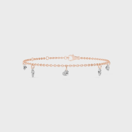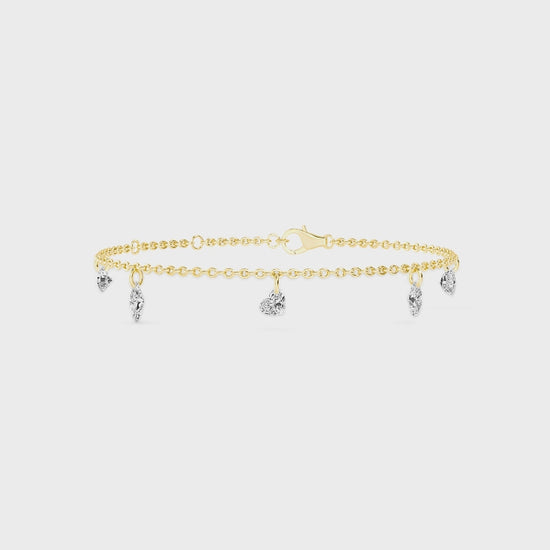 A modern and artistic twist on the classic diamond bracelet, featuring five pierced floating diamonds in a beautiful mix of marquise, oval, round, asscher, and heart shapes. With no basket or metal beneath them, each diamond is precisely pierced and set to create a seamless floating effect that sparkles from every angle.