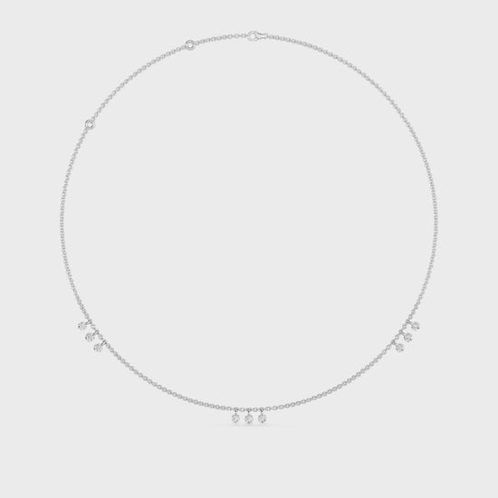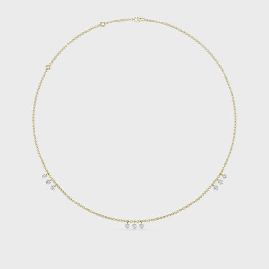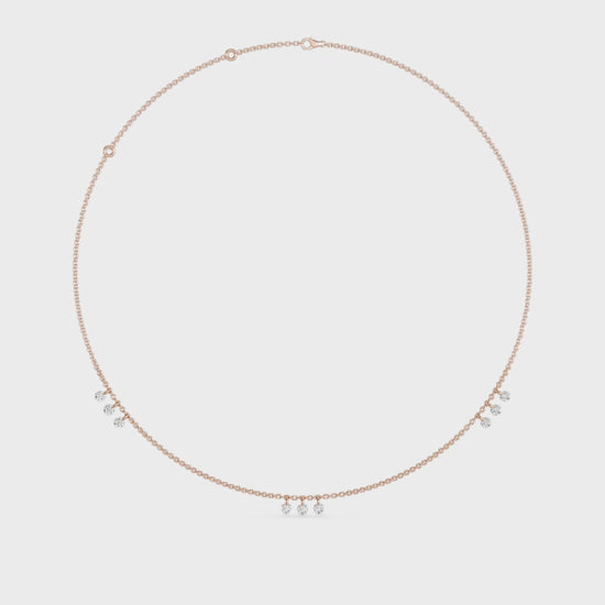 A modern and artistic twist on the classic diamond necklace, featuring nine pierced floating round diamonds that create a seamless, airy sparkle across the neckline. With no basket or metal beneath them, each diamond is precisely pierced and set to achieve a true floating effect, allowing the diamonds to shimmer effortlessly from every angle with a clean, minimalist look.