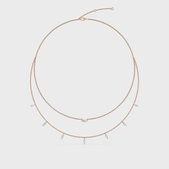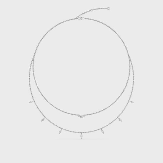 A refined two-layer diamond necklace designed to give the look of perfectly layered chains in one effortless piece. The upper strand features seven sparkling marquise diamonds set in classic baskets, creating a delicate line of brilliance that sits beautifully along the neckline. The lower strand showcases a single standout marquise diamond weighing approximately 0.34 carats, adding a touch of elegance and balance to the design.