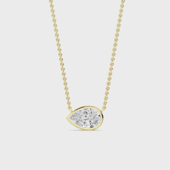Diamond solitaire necklace showcasing a 1.00 carat pear shaped lab grown diamond, graded F-VS1, beautifully colorless and exceptionally clean. The diamond is bezel-set east-west in rich 14k yellow gold, creating a modern, chic look that is perfect for everyday wear.