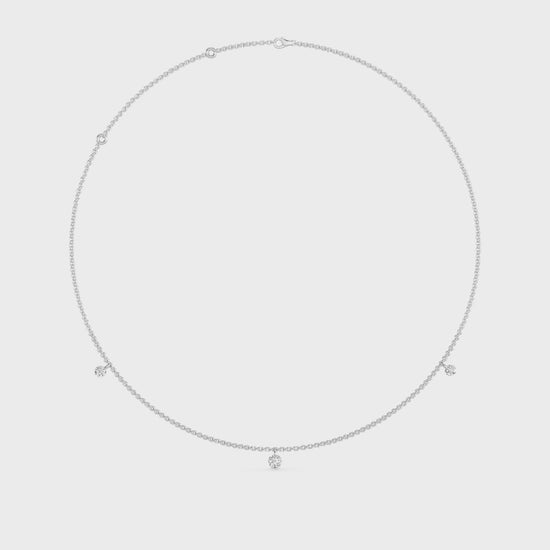 A modern and artistic twist on the classic diamond necklace, featuring nine pierced floating round diamonds that create a seamless, airy sparkle across the neckline. With no basket or metal beneath them, each diamond is precisely pierced and set to achieve a true floating effect, allowing the diamonds to shimmer effortlessly from every angle with a clean, minimalist look.