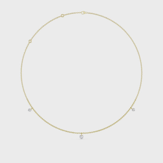 Crafted in solid 14k gold, this necklace blends contemporary elegance with exceptional craftsmanship. The diamonds total approximately 1.00 carats, with each round diamond weighing about 0.30 carats, in D–F color and VS–VVS clarity. The basket-free design maximizes brilliance and creates a weightless, refined feel while maintaining a secure and comfortable fit. Its chic, minimalist aesthetic makes it perfect for everyday wear and it layers beautifully with other necklaces for a modern, elevated look.