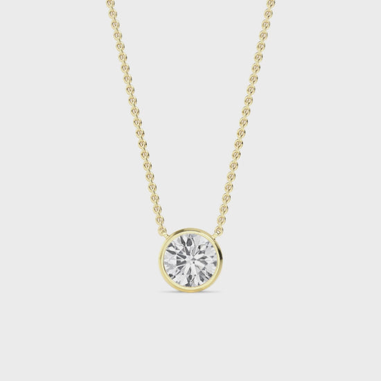 Diamond solitaire necklace showcasing a 1.00 carat round brilliant-cut lab grown diamond, graded F-VS1, beautifully colorless and exceptionally clean. The diamond is bezel-set in rich 14k yellow gold, creating a modern, chic look that is perfect for everyday wear.