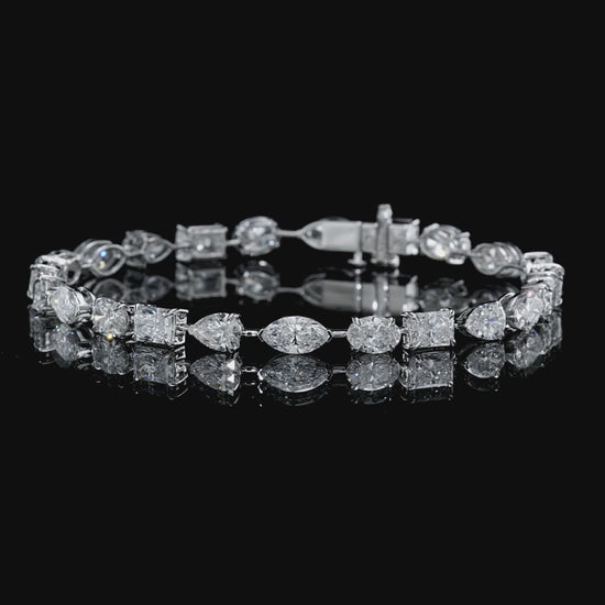 Timeless, refined, and beautifully balanced, this multishape diamond tennis bracelet is an elegant expression of modern sophistication. Featuring 23 perfectly matched colorless diamonds totaling 13.08 carats, the design showcases a graceful sequence of oval, pear, radiant, and marquise cuts, each chosen for its exceptional brilliance and harmony.