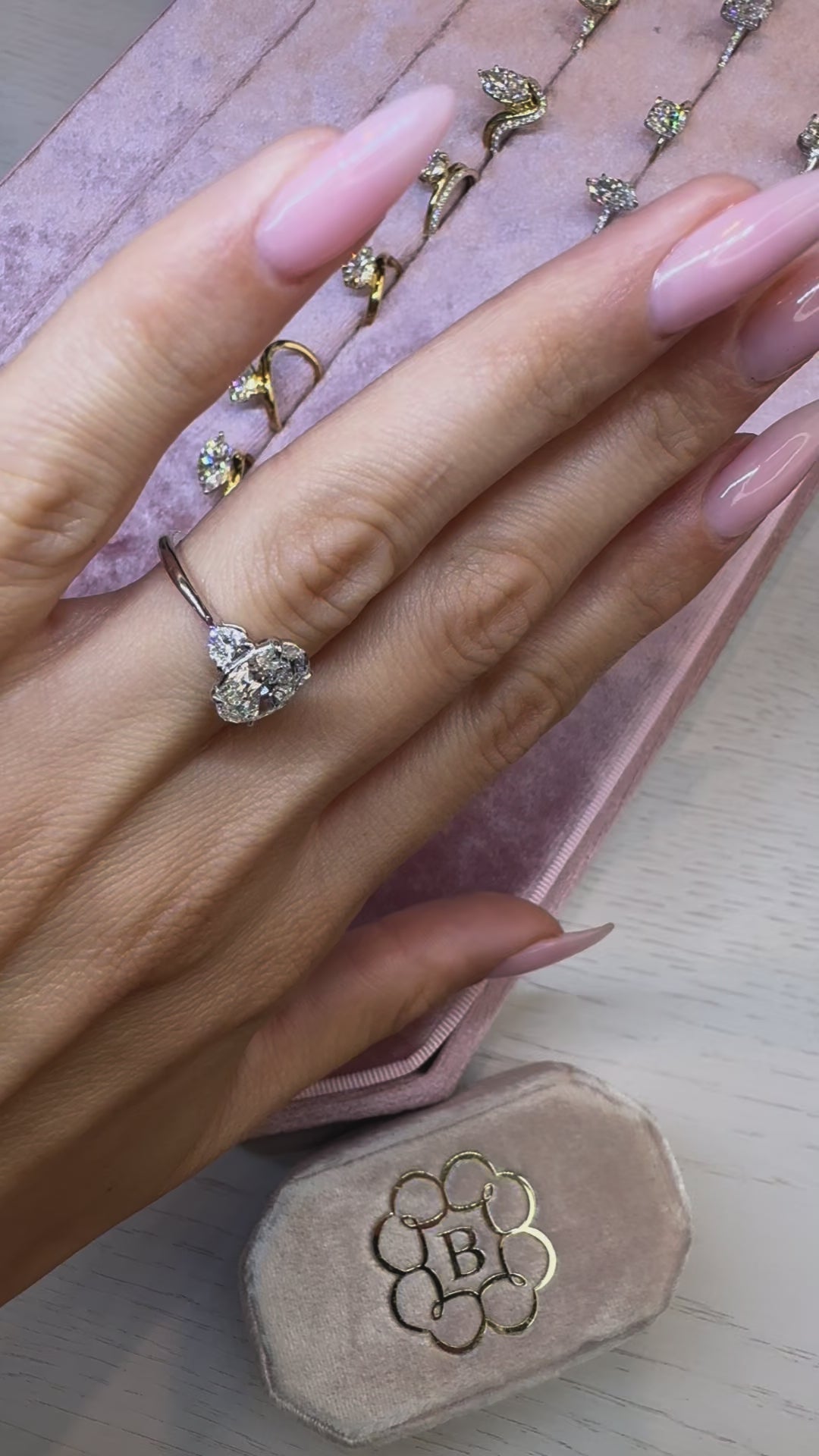Flanking the center are two perfectly matched heart-shaped lab grown diamonds totaling 0.40ct, adding a symbolic and elegant touch to this already breathtaking design. Set in high-polish 14k white gold, this ring beautifully blends classic charm with a unique silhouette.