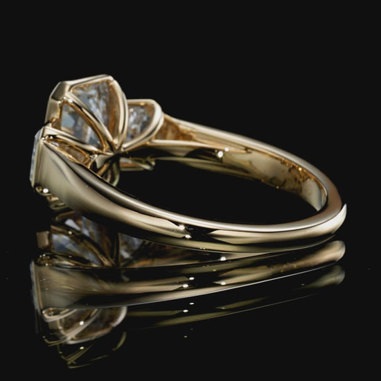 A modern chic take on a timeless classic, this handcrafted three-stone engagement ring features a captivating 2.07 carat radiant cut diamond, bezel set to perfection in 14K yellow gold. Flanked by matching 0.48ct radiant cut side diamonds, the sleek bezel design creates a seamless flow of brilliance and contemporary elegance. IGI certified at E color and VS1 clarity, the center diamond is colorless, exceptionally clean, and masterfully cut for maximum sparkle. A refined yet bold statement piece that embodies modern sophistication. Includes IGI certification, appraisal, and our lifetime warranty.