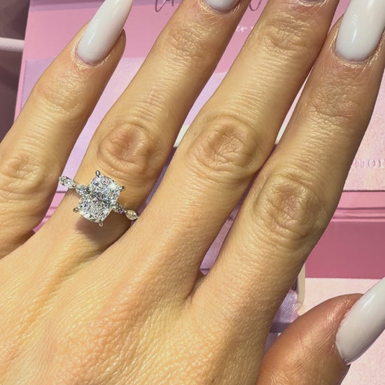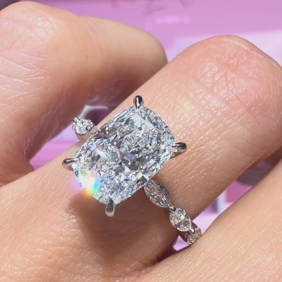 3.01 Carats Lab Grown Elongated Cushion Cut with Marquise Side Stones Hidden Halo Diamond Engagement Ring