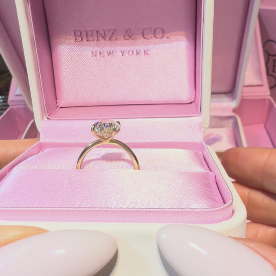 Handcrafted in rich 14K yellow gold, the warm tone of the gold beautifully enhances the diamond’s brightness and creates a timeless yet modern look. A delicate hidden halo of round brilliant diamonds beneath the center stone adds a subtle touch of extra sparkle from every angle.