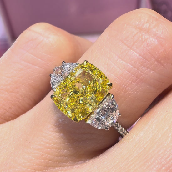 A refined expression of timeless elegance and exceptional quality, this classic three-stone engagement ring is centered around a captivating 2.51 carat Fancy Vivid Yellow elongated cushion-cut lab grown diamond, IGI certified and graded VVS2 clarity. The center diamond’s vivid saturation and elegant proportions create a striking balance of presence and sophistication, instantly drawing the eye.