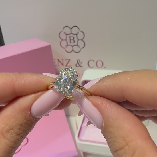 This refined solitaire features a 3.32 carat elongated old mine cut lab grown diamond, graded E color and VVS2 clarity, set in warm 14K yellow gold. The antique-style diamond showcases broad, chunky facets and a softly open culet, producing a romantic glow and distinctive depth as light moves through the stone.