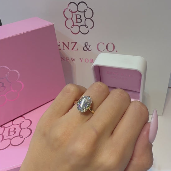 This refined solitaire features a 3.80 carat elongated old mine cut lab grown diamond, graded F color and VVS2 clarity, set in warm 14K yellow gold. The antique-style diamond showcases broad, chunky facets and a softly open culet, producing a romantic glow and distinctive depth as light moves through the stone.