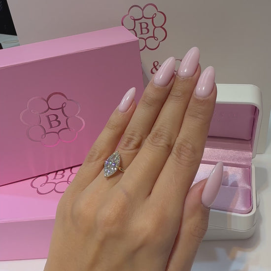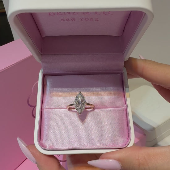 A clean compass-style prong setting keeps the focus entirely on the marquise shape’s sharp points and graceful curves, while the low-sitting profile ensures comfort and effortless everyday wear. Timeless yet modern, this design highlights the marquise cut’s dramatic form with refined simplicity.