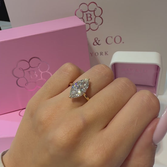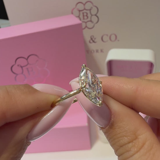 This refined solitaire features a 3.00 carat marquise cut lab grown diamond, graded E color and VVS2 clarity, set in warm 14K yellow gold. The marquise cut’s elongated silhouette and brilliant faceting create exceptional sparkle while visually lengthening the finger, offering a striking balance of elegance and presence.