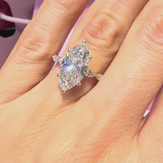This gorgeous 4.02ct marquise cut diamond engagement ring features our Celeste setting, our number one best seller, loved for its elegant lines and unmistakable sparkle. The striking 3.00ct marquise center diamond is IGI certified, graded E color and VVS2 clarity — colorless, exceptionally clean, and beautifully cut for maximum brilliance.