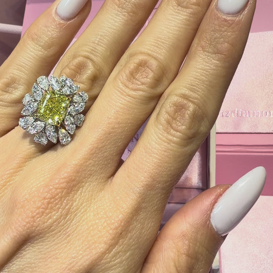 A celebration of rarity, brilliance, and refined craftsmanship, this extraordinary ring features a striking 3.64 carat Fancy Intense Yellow cushion-cut lab grown diamond, IGI certified and graded VS1 clarity. The center diamond radiates rich golden warmth and elegant fire, creating an unforgettable first impression.